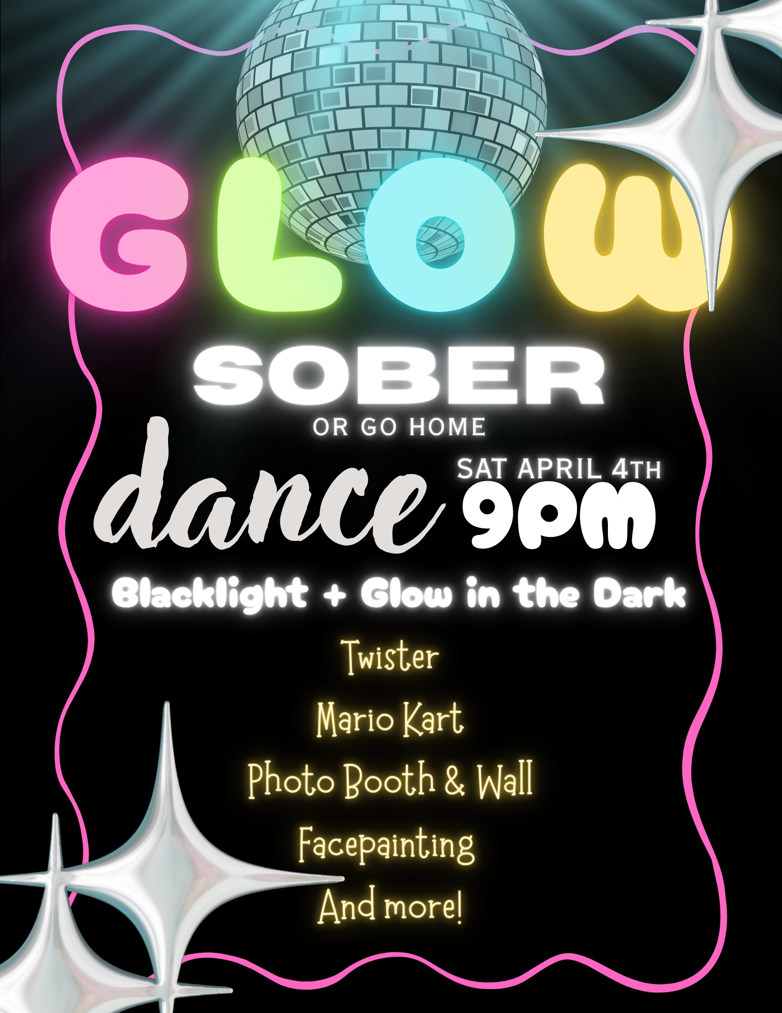 GLOW SOBER or Go Home! Blacklight and glow in the dark dance for everyone, young and old. Featuring Twister, Mario Kart, Photo Booth & Wall, Facepainting, and more!